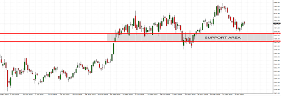 • SUPPORT AREA: $420 - $400. Since September 2025, the stock price has maintained a strong support area between $420 and $400.