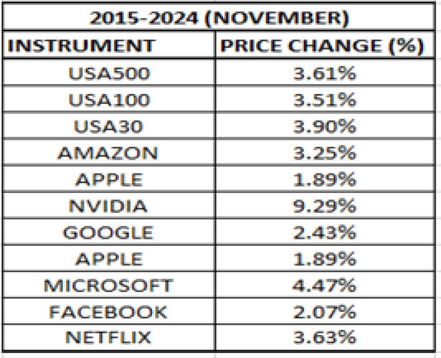 - HISTORICAL TREND (2015–2024): USA100 PRICE ROSE ON AVERAGE 3.51% IN NOVEMBER OVER THE LAST 10 YEARS. The USA100 has shown strength during November, averaging a 3.51% gain over the past decade, supported by upbeat earnings from major tech giants and increased investor optimism heading into the holiday shopping season.