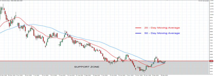- SUPPORT AREA: $6,000. Since early October 2025, after testing the area below $6,000, Cocoa prices tended to return above $6,000, indicating a possible support area.