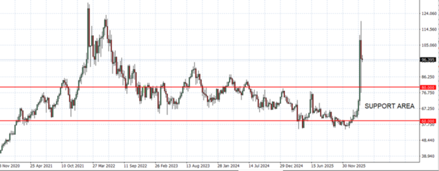 • SUPPORT AREA: $80. After rising to its highest level since June 2022 ($119.40), crude oil prices have now found support around the $80 level or below. Since the war began, crude oil has surged about 77%, reaching prices not seen in almost four years and pushing the market firmly above $80.