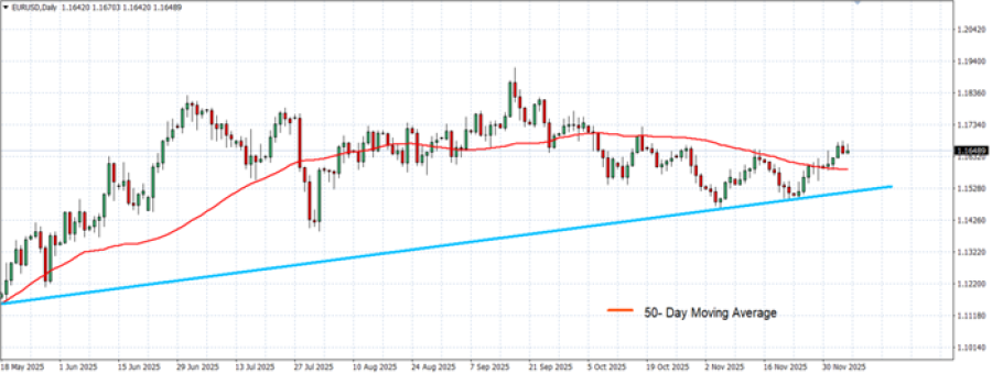 - LONGER-TERM UPTREND: Since late May 2025, EUR/USD has been moving within a steady rising trend, supported by the upward-sloping blue trendline. The pair continues to trade above this trendline, confirming that the broader upward structure remains intact despite several periods of sideways consolidation.