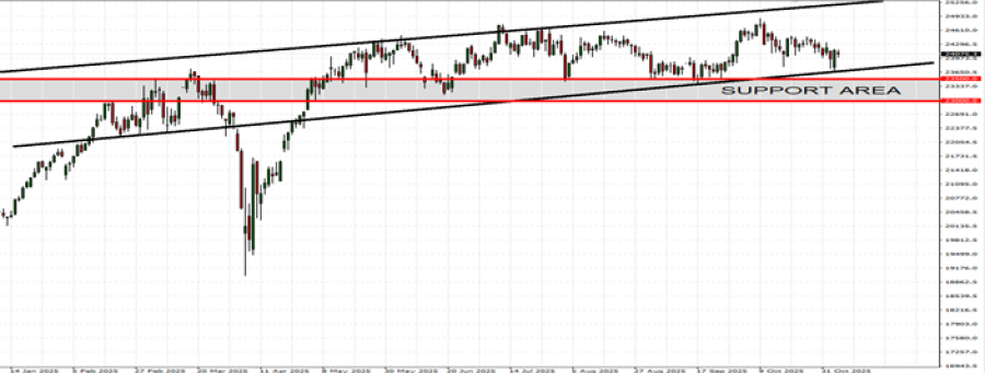 • SUPPORT AREA: 23,000 – 23,5000. According to the chart below, GER40 has maintained strong support with the area between 23,000 and 23,500 at least since May 2025.