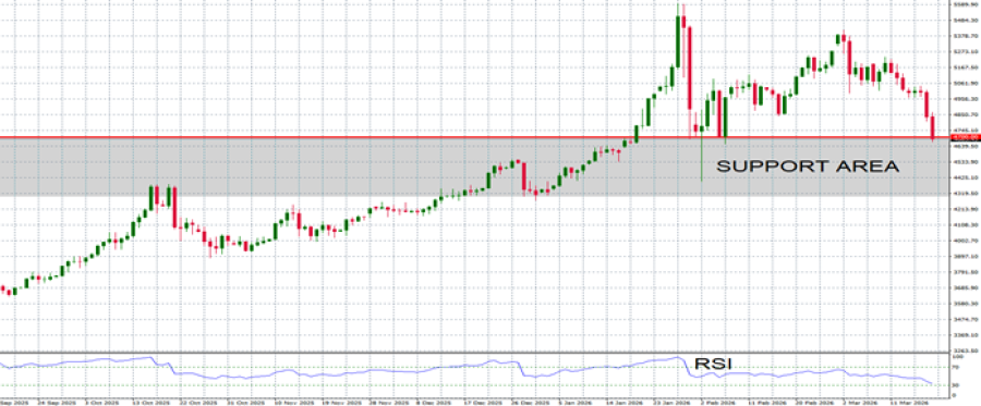 - SUPPORT AREA: $4,700. The recent decline has pushed gold prices down to a new key support level around $4,700. This area could act as a short-term floor, although a sustained break below it would signal further downside risk.