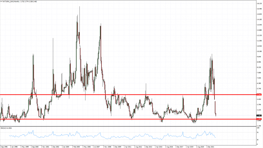 - NATURAL GAS HIT ITS LOWEST PRICE IN 2 YEARS AND 5 MONTHS ($2.110): Natural Gas has undergone a downward correction of around 79% since August 21, 2022 (down from its 2008 high of $9.972). Natural gas traded last around $2.60 and if a full recovery followed, that could imply an upside of around 2800%. However, the price could also decline further.