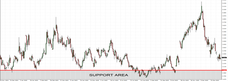 • STRONG SUPPORT ZONE AT $3.00: Since late 2024, natural gas has repeatedly found strong support near the $3.00 level, with prices rebounding toward $3.50 or higher each time the market approached this zone. This area has been tested seven times since November 2024, with natural gas prices rising by an average of around 34% after testing this key support level. However, it could also decline.