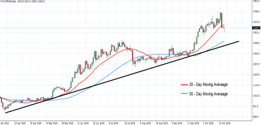 - UPTREND STRUCTURE: The rising trendline (black) extending from April 2025 remains firmly intact. Recent pullbacks have found support near the 20-day MA. As long as platinum holds above the 50-day MA and the trendline, the broader outlook stays constructive, with potential for another leg higher toward recent highs.