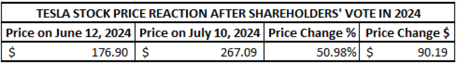 - LAST TIME (JUNE 13, 2024): ANNUAL SHAREHOLDER MEETING 2024. TESLA’S SHAREHOLDERS VOTED IN FAVOUR OF CEO ELON MUSK'S PAY. According to Reuters, Tesla shareholders approved CEO Elon Musk's $56 billion pay package, a big thumbs-up to his leadership and an incentive to keep his focus on his biggest source of wealth. The approval underscored the support that Musk enjoys from Tesla's retail investor base, many of whom are vocal fans of Musk. The proposal passed despite opposition from some large institutional investors and proxy firms.