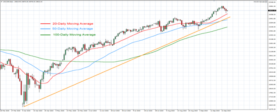 - UPTREND SINCE APRIL 2025: As depicted by the daily chart below, USA100 has kept trading above the orange uptrend line since April 2025, confirming the positive trend. However, there remains a risk of a potential breakout below the orange uptrend line if market conditions change.