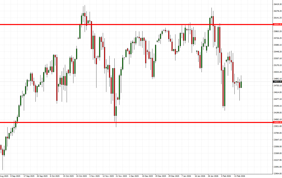 - CHANNEL SIDEWAYS BETWEEN 24,000 AND 26,000: The USA100 price has been moving within a range between 24,000 and 26,000 since August 2025. It has tested the lower boundary near 24,000 three times. Each time the USA100 tested this region, it recovered and moved toward the upper boundary around 26,000.