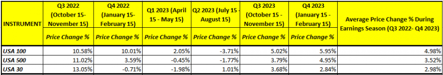 - LAST SIX QUARTERLY EARNINGS SEASONS: THE ARTIFICIAL INTELLIGENCE (A.I.) EUPHORIA. The table below illustrates price reactions of the three major US stock indices. On average, the USA 100 index has risen by 4.98% each quarterly earnings season since Q3 2022. Over the same period, the USA500 index rose 3.52%, while the USA30 index climbed around 3.00%.