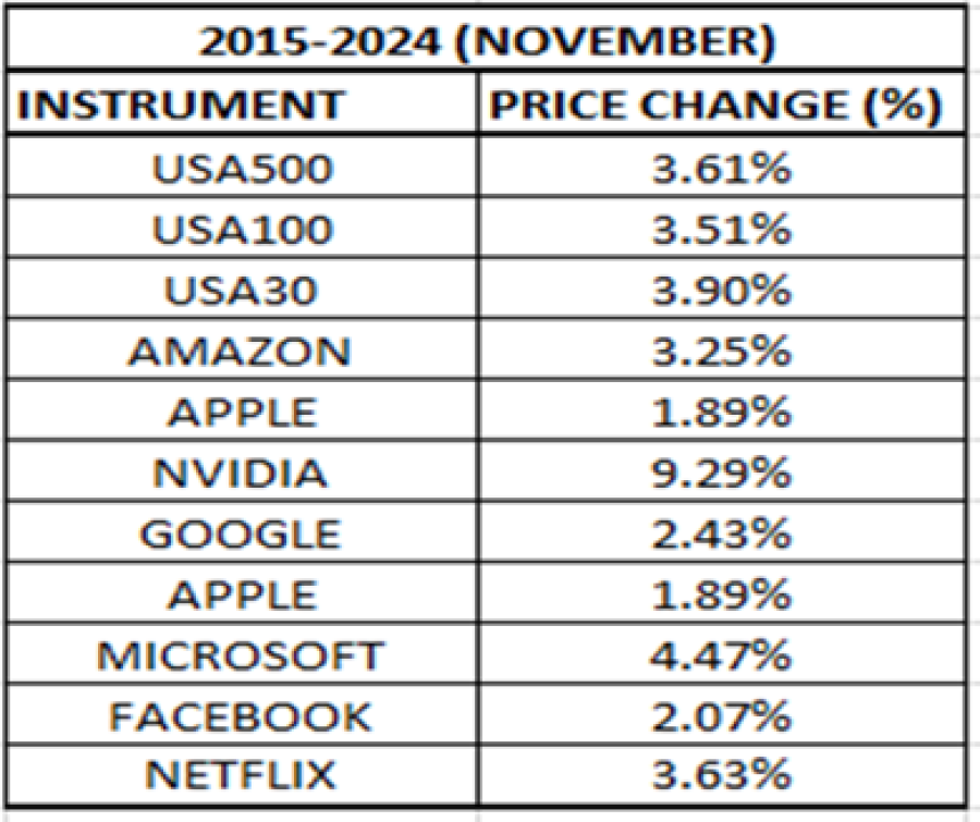 INDIVIDUAL STOCKS: Leading USA500 components such as NVIDIA (+9.29%), Microsoft (+4.47%), and Netflix (+3.63%) have historically delivered positive November performances.